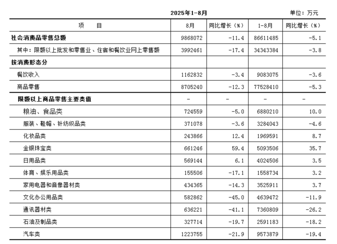 在社会消费品零售总额中,商品零售和餐饮收入是两大主要组成部分。数据显示,1-8月商品零售实现7752.8亿元,同比下降5.3%;而餐饮收入则为908.3亿元,同比下降3.6%。这两大领域的双双下滑,无疑加剧了消费市场的整体压力。