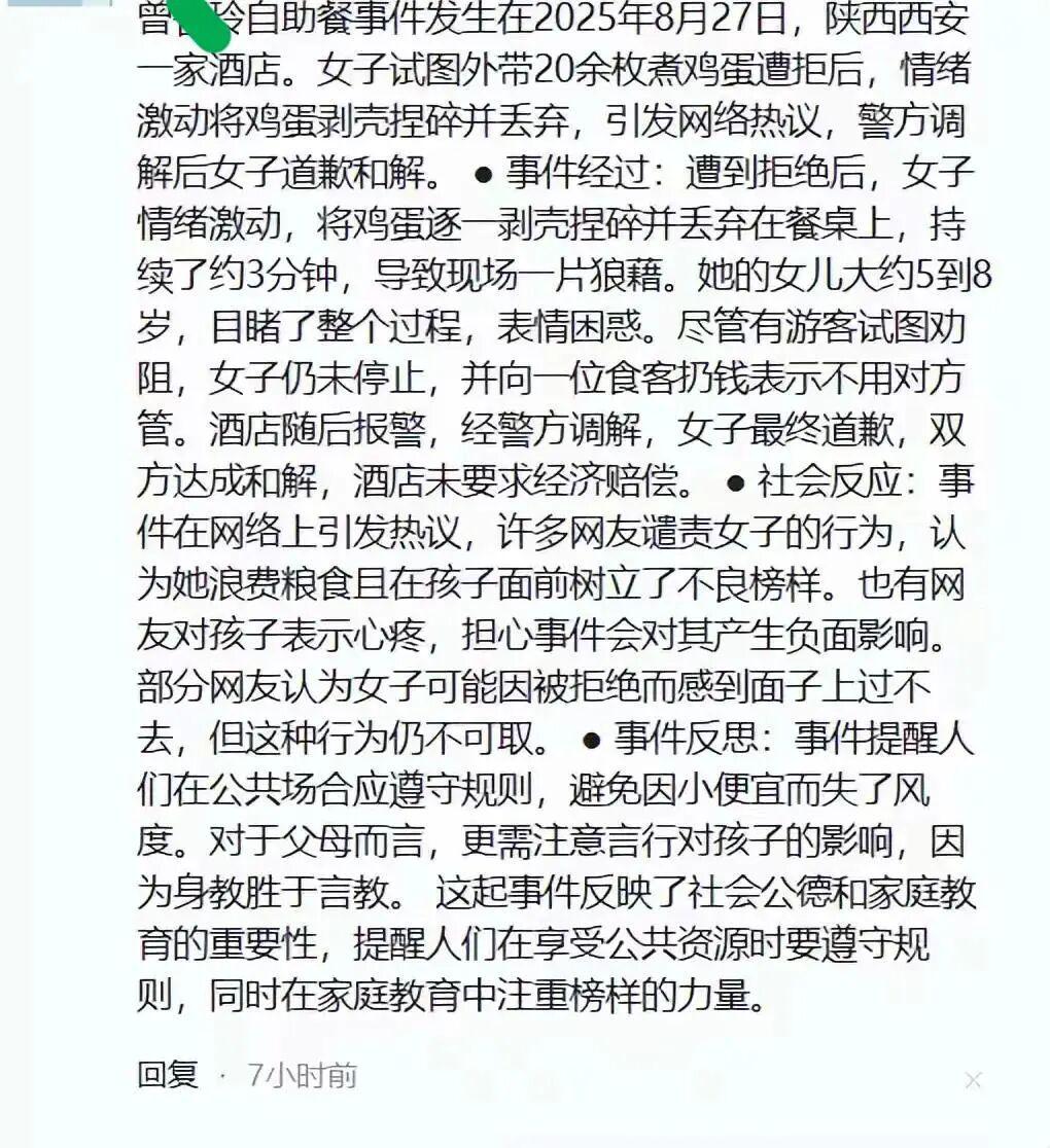 而这件事最扎心的地方在于:她浪费的不是鸡蛋,而是这个时代最稀缺的东西——敬畏心。我们不再饿肚子了,于是开始轻视粮食;我们有了点钱,就开始蔑视规则;我们自以为“付了钱就是上帝”,就可以对服务者呼来喝去。可你忘了,真正的体面,不在你吃什么,而在你怎么吃。