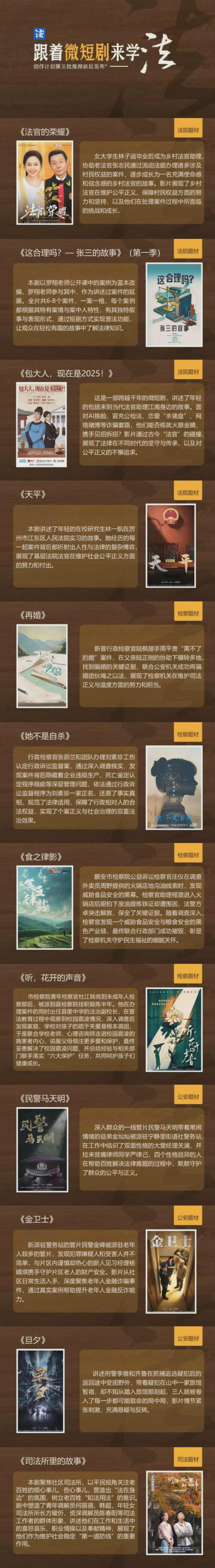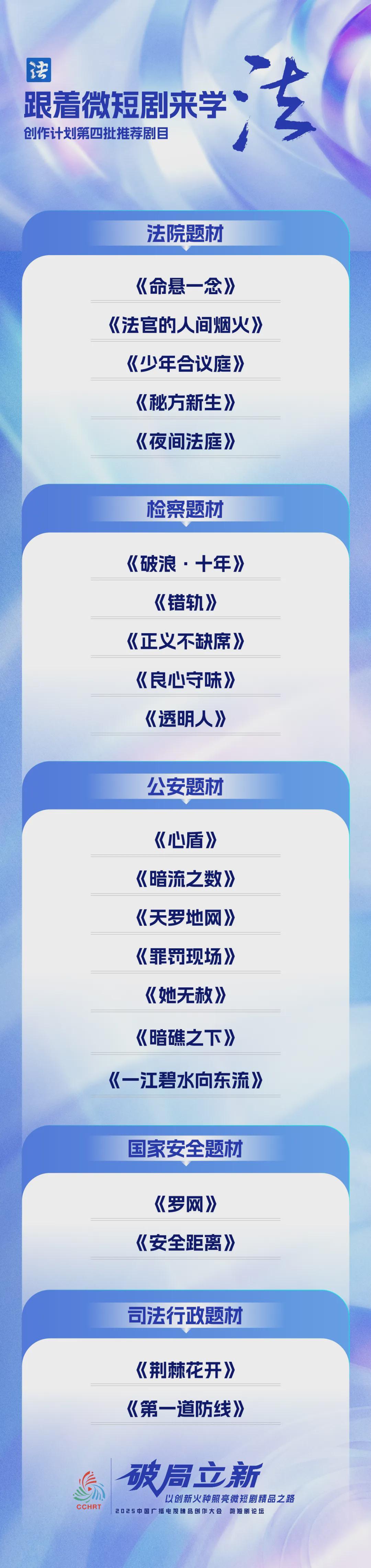 国家广播电视总局网络视听节目管理司正式发布‘跟着微短剧来学法’创作计划第四批推荐剧目。此次发布的21部作品题材广泛,覆盖法院、检察、公安、司法行政等多个法治领域,并首次将国家安全题材纳入推荐范围,标志着普法宣传与微短剧创作的深度融合。