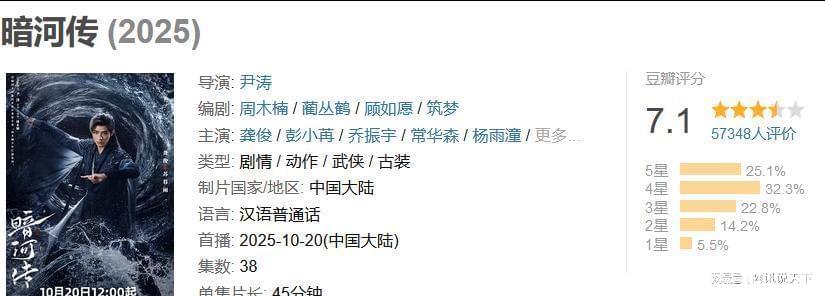 《暗河传》以7.1分的成绩在四部剧中暂时领先,参与打分人数已突破5万。其中,32.3%的观众给出了四星,25.1%的观众给出了五星,一星和二星占比不到20%,三星占比22%。