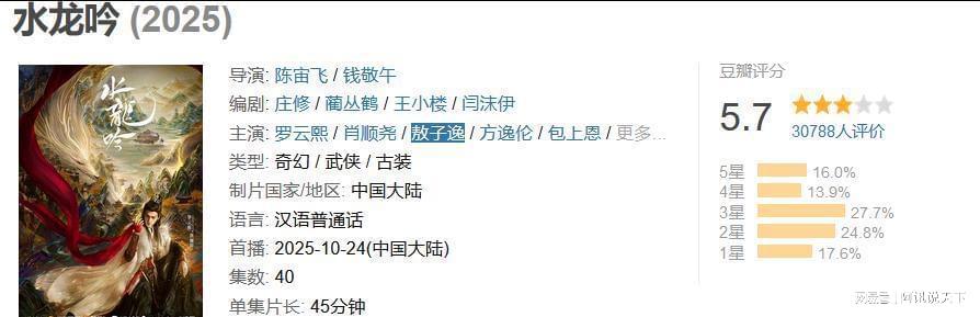 《水龙吟》开分5.7,未能及格,三万多人打出了这个分数。其中,三星和二星占据了5%左右,一星达到了17.8%,五星和四星仅占29.9%。