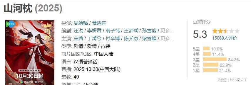 《山河枕》作为同期在播剧中最晚开播的,10月30日开播,仅播出5天11集的情况下,被1.5万人打出5.3的分数,创下了最快开分记录。一星到三星的人数占比高达78.6%,四星五星仅占21.4%,这个分数算得上是同期在播剧垫底的存在了。