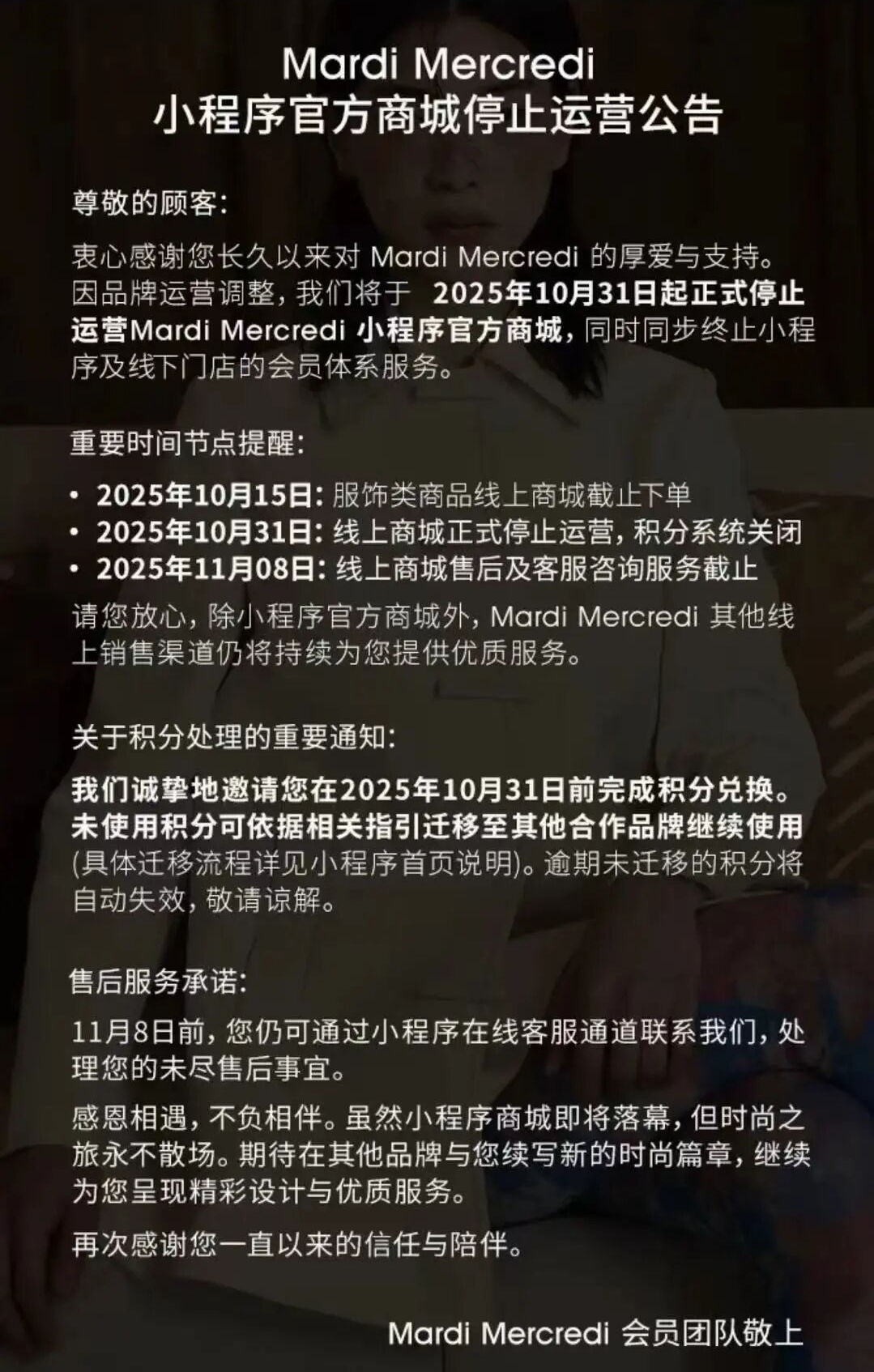 11月3日,记者从Mardi Mercredi天猫旗舰店客服处获悉,因线下业务优化调整,全国门店已停止运营。与此同时,品牌微信小程序官方商城发布公告称,自10月31日起停止运营,并同步终止小程序及线下门店的会员体系服务。