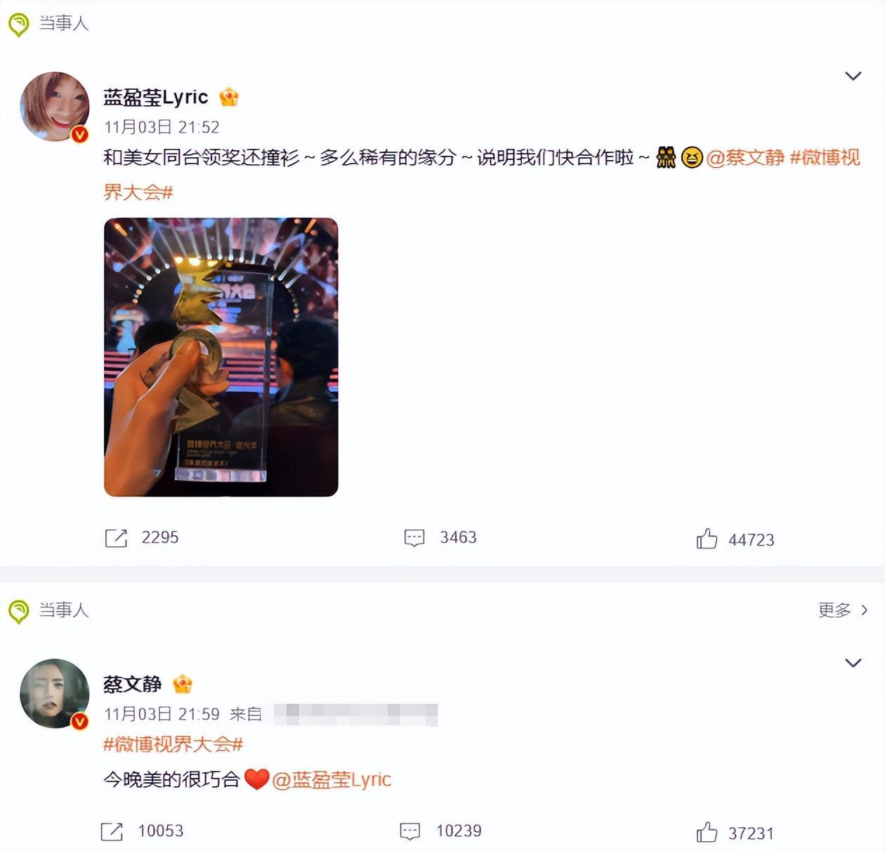 蓝盈莹上台后,跟她穿搭相似的蔡文静脸色明显挂不住了,好在事后两人在社交平台互动了一下,也算是给彼此留了一个体面。