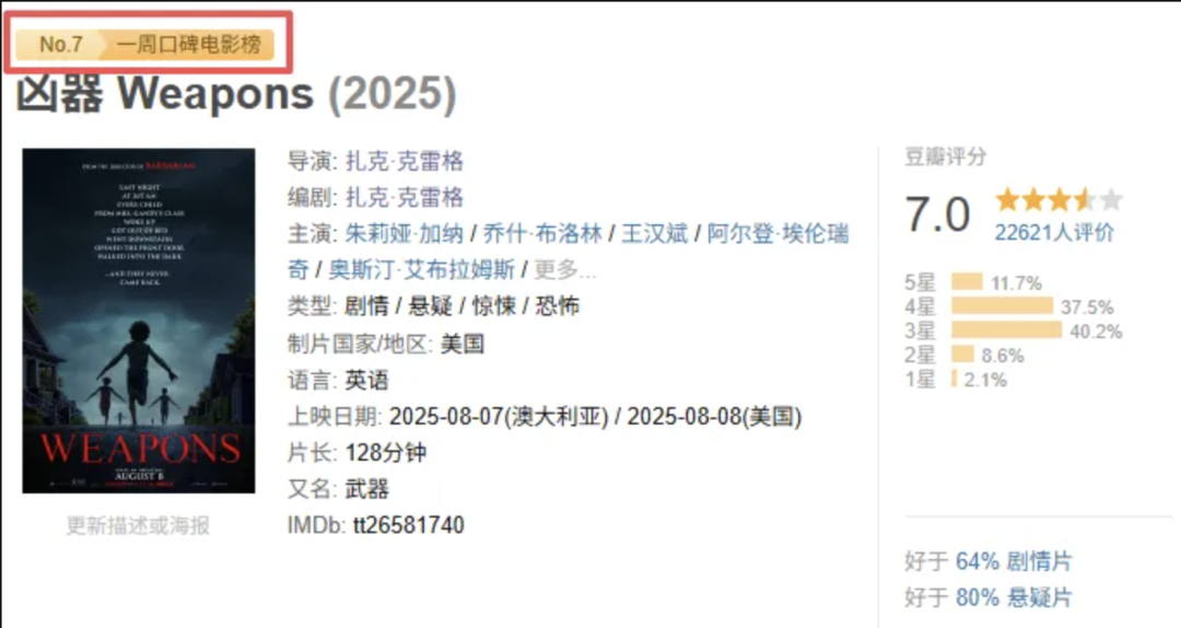 IMDb7.6与豆瓣7.0的评分,在同类型中也称得上口碑优秀。
