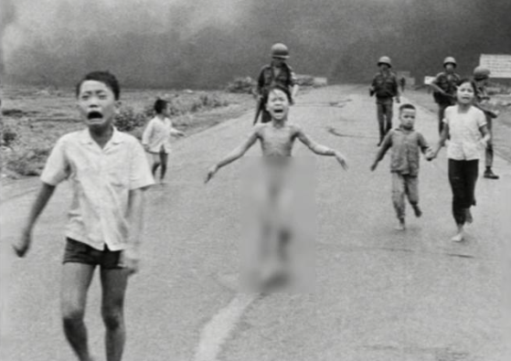 有网友也扒出,这个动作其实也和越战期间一张名为「被燃烧弹烧伤的女孩」的照片很像。