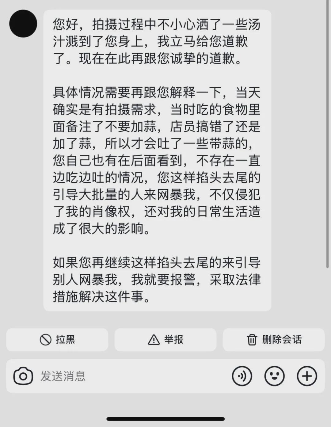 面对质疑,涉事博主于10月30日联系王先生解释称,当时食用的食物中含有大蒜成分,呕吐物仅含蒜味物质,否认存在故意边吃边吐的行为。该博主同时表示将采取法律措施维护权益。