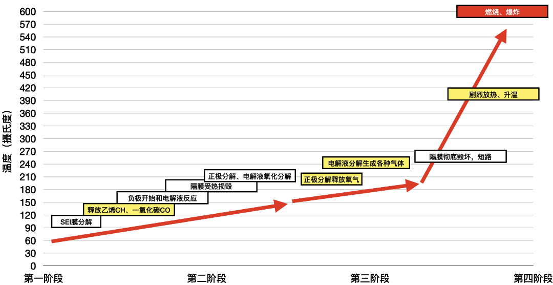 一旦电池进入热失控,电池内部就会引发各种连锁反应,甚至都不用很热,只要100多度就已经足够启动“毁灭之旅”了——110度左右,石墨负极就会开始和电解液反应,150度左右,隔膜就会融化,进而导致短路,温度急剧升高——电解质里的有机溶剂受热会分解出氢气、一氧化碳、甲烷、烃之类的易燃易爆气体,正极材料则会在高温下分解释放出大量的氧,只要温度再高一点点,就会导致剧烈的燃烧乃至爆炸。