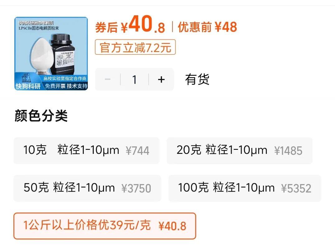 反观固态电池这边,不管是聚合物电解质PEO,还是氧化物电解质LLZO,每公斤的价格都成千上万,硫化物电解质(锂磷硫氯)更是贵到了接近4万元/公斤的价格——我电脑差不多也是一公斤重,整体也才一万多的价格。