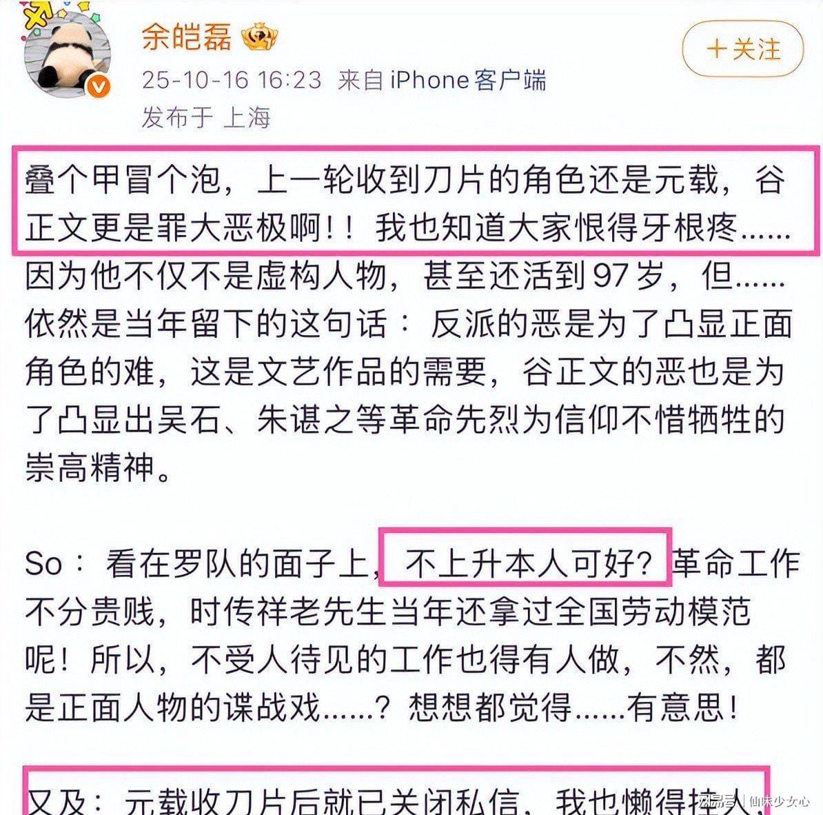 可同样贡献教科书级演技的余皑磊,评论区却被"滚出娱乐圈""现实中肯定也是坏人"的留言攻陷,最后不得不彻底关停社交账号。