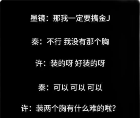 更毁节操的是,王导还明确跟秦雯说“我一定要搞金J”,原因是后者xiong大。其实金J谈不上有多漂亮,就因为xiong大,王导就“一定要搞”,其对xiong的痴迷可见一斑。