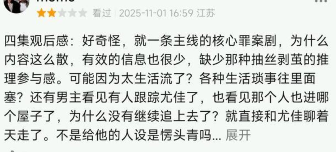 你讲生活不够生活,说自己是悬疑剧但根本没有那种抽茧剥丝的推理参与感。