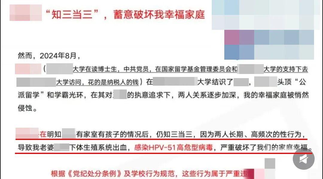 近日,一封长达67页的PPT举报信在网络引发热议。据粉丝投稿,某985高校土木工程学院公派博士生(男)在美国访学期间,插足他人婚姻,将一名已婚女性从杭州带至英国,回国后仍保持不正当关系,最终导致该女性感染高危型HPV-51病毒。