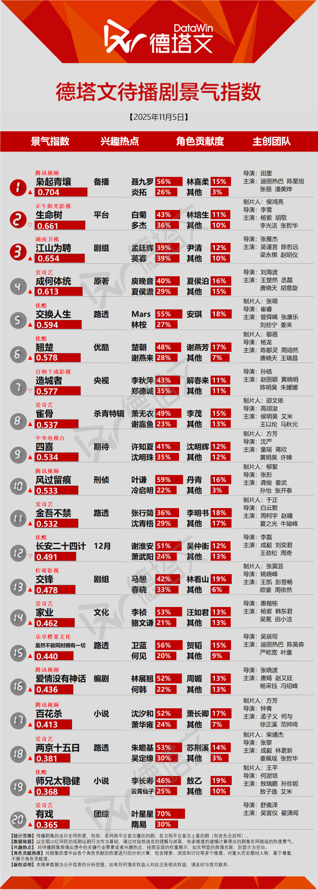 德塔文电视剧景气日报 2025-11-05 电视剧当日景气TOP10