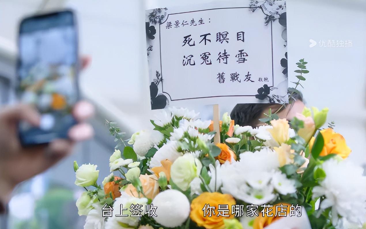 在亲友轮流上前悼念的环节,忽然一束花被搬到了现场,上面还插了一张纸——