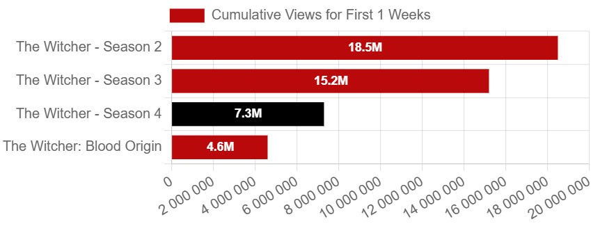 曾几何时,Netflix的奇幻巨制《猎魔人》被视为流媒体平台最具潜力的王牌项目之一。然而随着剧情推进,这部改编自安杰伊·萨普科夫斯基小说的剧集逐渐失去光环,第四季(由利亚姆·海姆斯沃斯接替亨利·卡维尔饰演杰洛特)的播出数据更是印证了其跌落至"二线剧集"的残酷现实——首周观看量出现断崖式下跌。