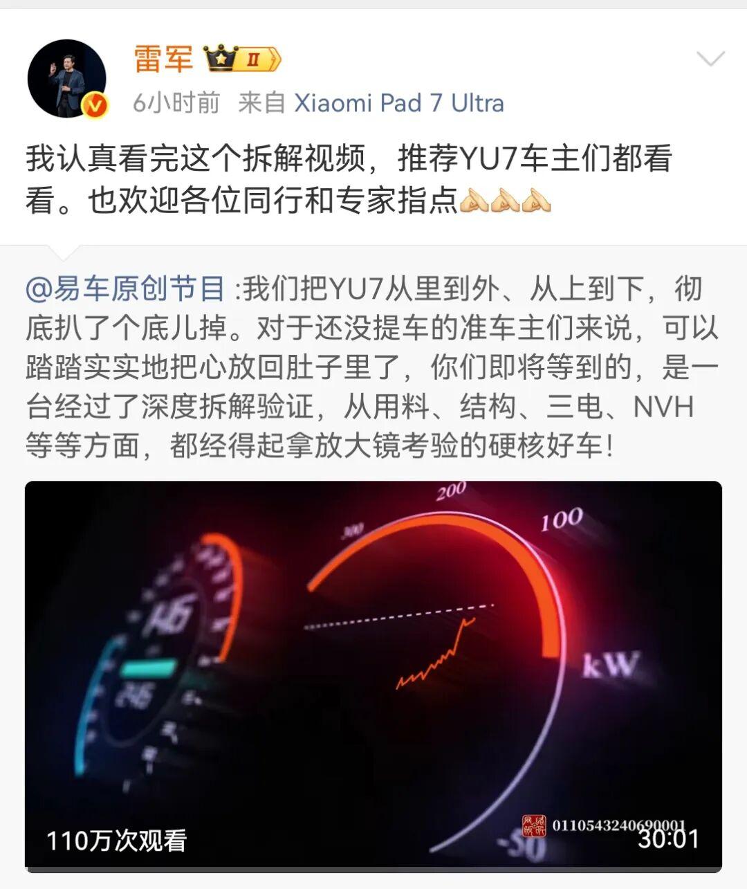 雷军本人也对小米YU7的拆解视频进行了转发,并且表示:“我认真看完这个拆解视频,推荐YU7车主们都看看,也欢迎各位同行和专家指点。”