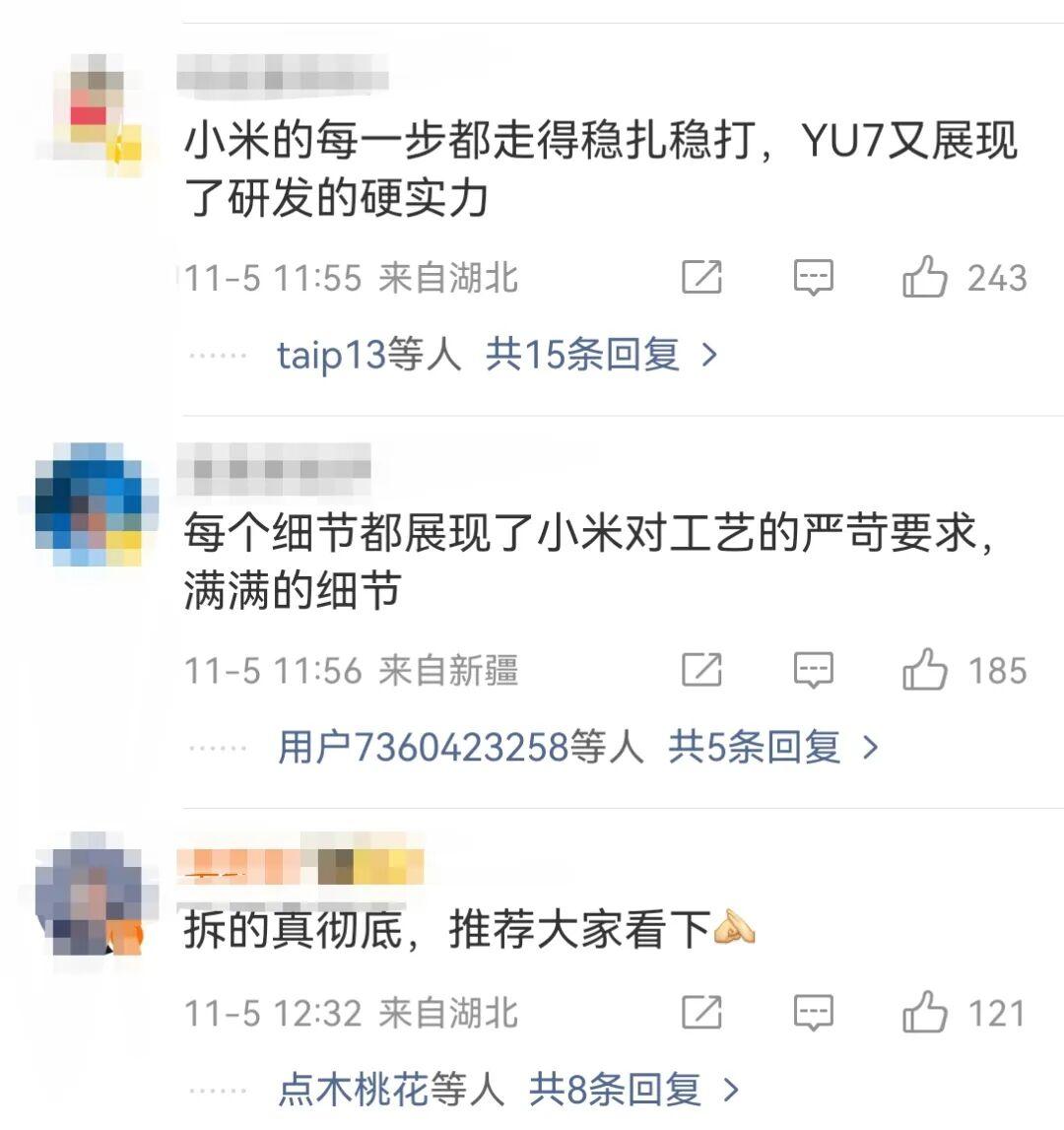 许多网友在小米YU7的拆解视频下面留言,表示车的质量很不错,“满满都是细节”。