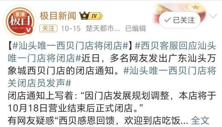 但与此同时,西贝闭店的消息频繁出现在社交媒体上。比如刚刚进入11月,位于深圳的西丽万科云城西贝店就贴出了“闭店通知”。