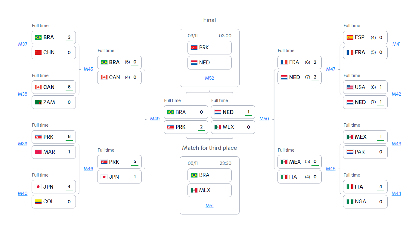 作为卫冕冠军,朝鲜女足在本届赛事中展现出统治级表现。小组赛阶段,她们先后以2-0战胜墨西哥、2-1击败喀麦隆、5-0横扫荷兰,三战全胜积9分以头名身份出线。淘汰赛阶段,朝鲜女足延续强势:1/8决赛6-1狂胜东道主摩洛哥,1/4决赛5-1大胜日本,半决赛面对曾淘汰中国女足的巴西队,朝鲜女足上半场多打一人并取得1-0领先,下半场再入一球,最终2-0完胜对手。