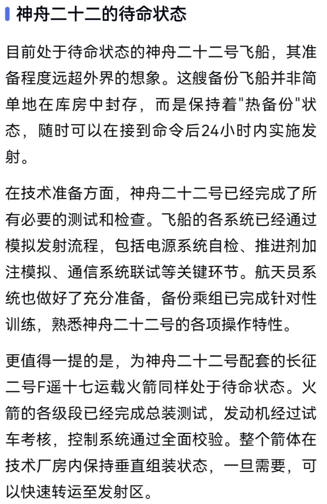 因此,当神舟二十号出现这种紧急情况后,神舟二十二号飞船早已在发射场严阵以待,同时具备了快速发射的能力,随时可以用于紧急救援。