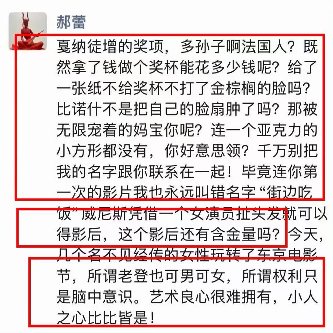 据网友解读,郝蕾朋友圈发文主要涉及三起争议事件:其一,2025年戛纳电影节新增评审团特别奖授予毕赣导演的《狂野时代》,郝蕾质疑该奖项“徒增形式”,认为“给了一张纸不给奖杯”的做法消解了金棕榈的权威性,甚至暗讽评审团主席朱丽叶·比诺什的决策动机。其二,辛芷蕾凭借《日掛中天》获得威尼斯电影节最佳女主角,郝蕾调侃其表演为“女演员扯头发”,批判国际电影节对“戏剧化”“外化式”表演的偏好。其三,东京电影节《春树》团队评选结果引发争议,女主角白百何颗粒无收,而戏份较少的王传君却斩获最佳男主角。