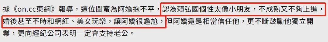 “赖弘国婚后仍与网红、美女玩乐,让阿娇很尴尬。”