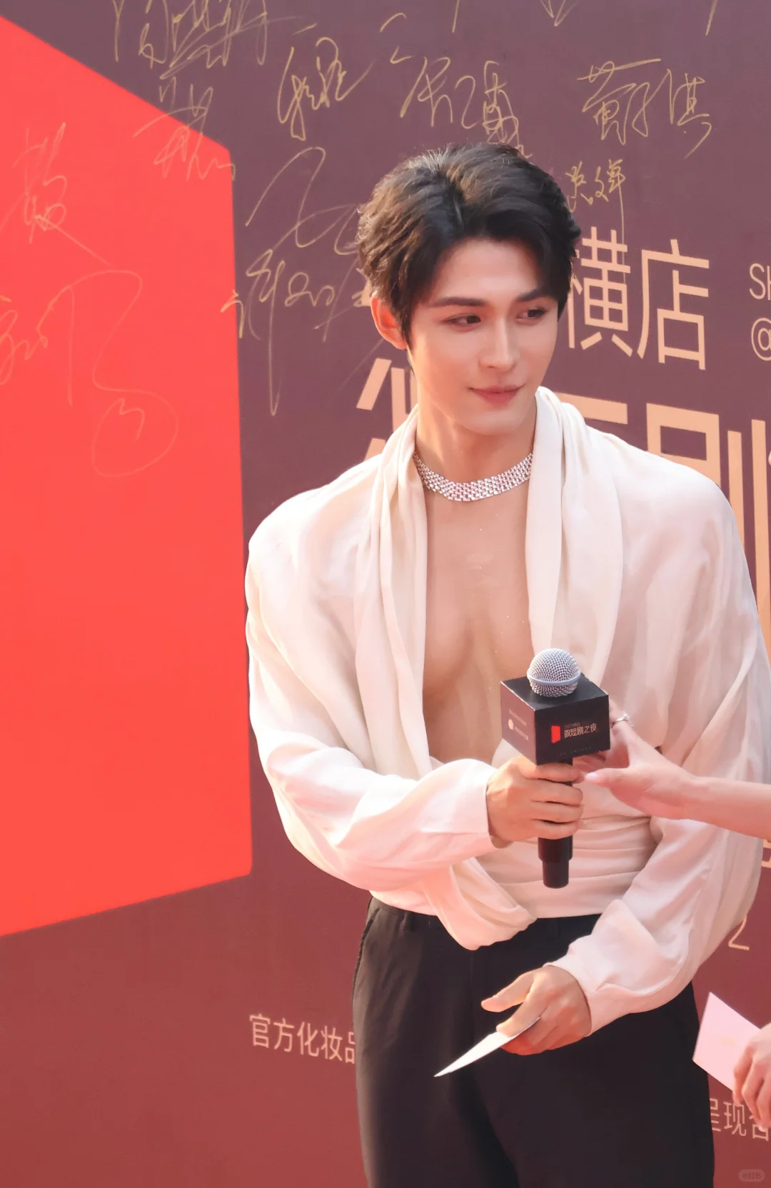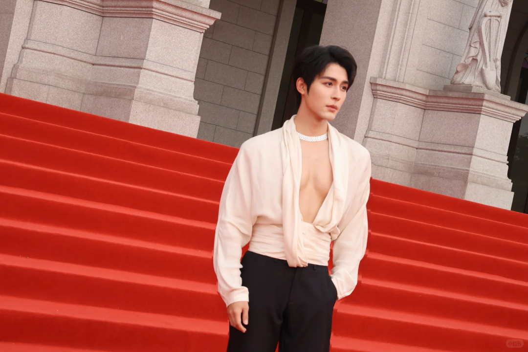 当他与同场女演员一同亮相时,那件敞开的深V上衣若隐若现地露出胸部轮廓,让网友不禁调侃:"还以为他俩在直播打PK呢!"