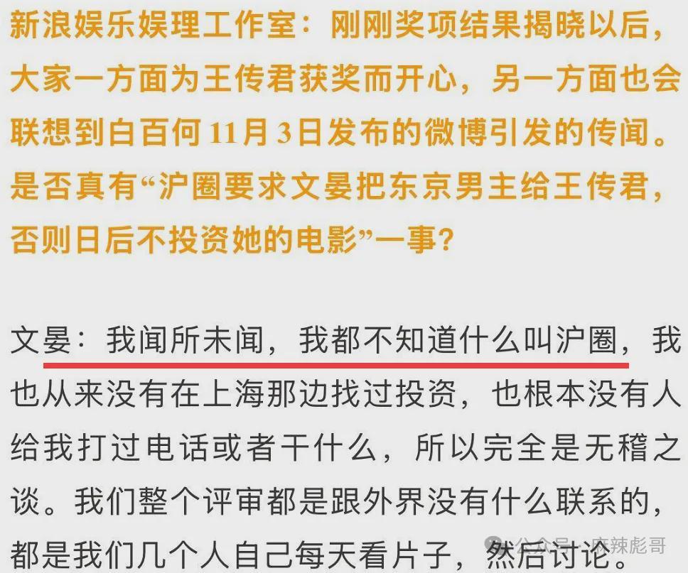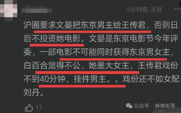 爆料里说,沪圈要求文晏把东京男主给王传君,否则日后不投资她电影。