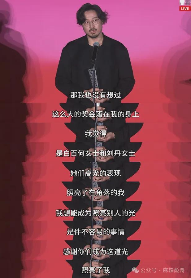 又说没想到这么大的奖会落在自己身上,是白百何和刘丹女士高光的表现照亮了在角落的他。