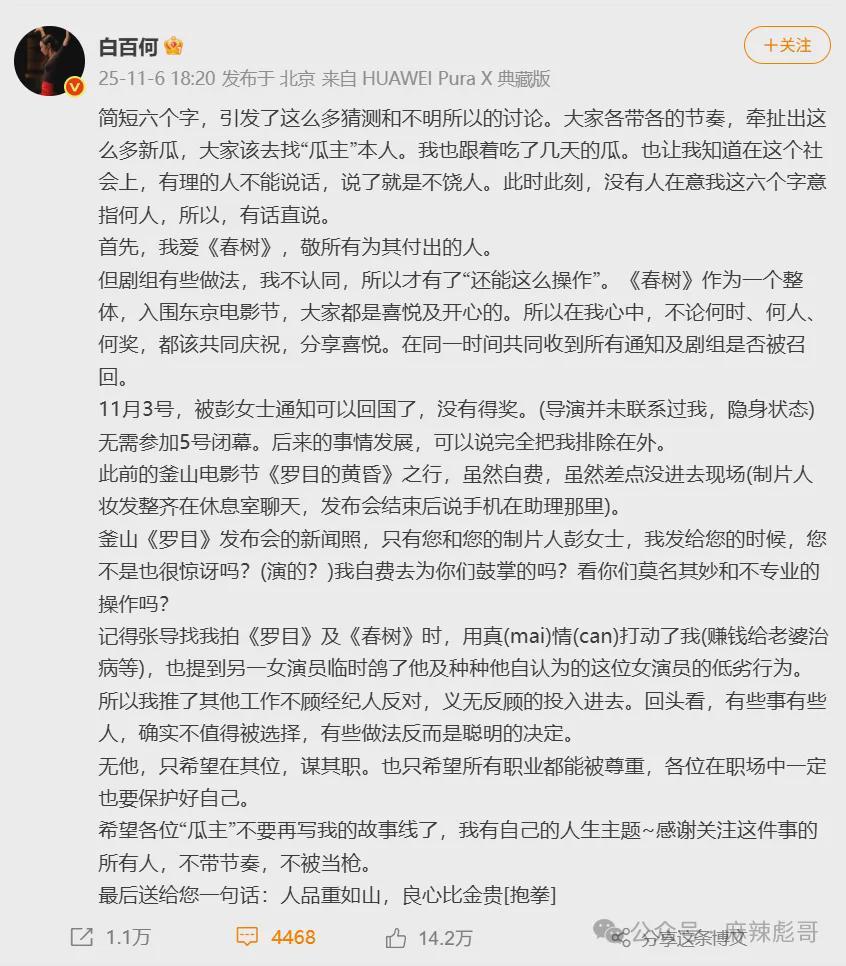 11月3日,东京电影节评奖之际,白百何发出一条微博。
