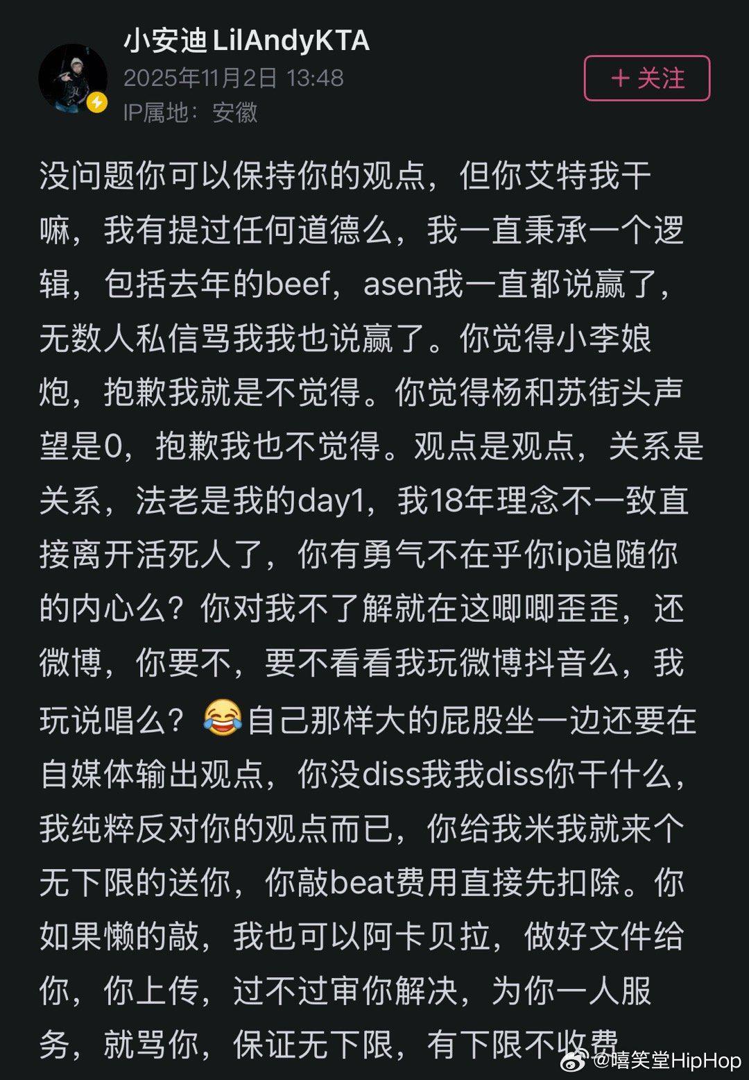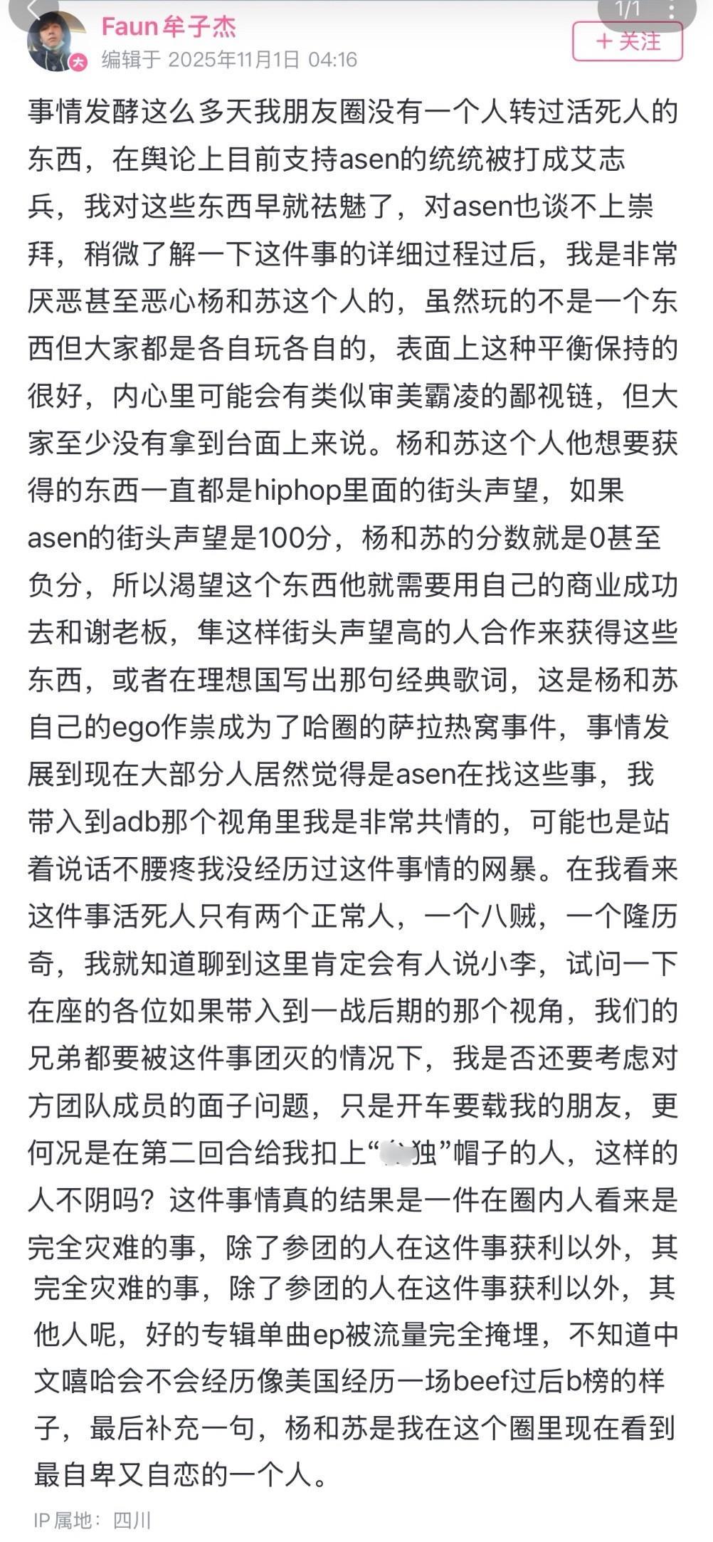 “如果asen的街头声望是100分,杨和苏的分数就是0甚至负分,所以渴望这个东西他就需要用自己的商业成功去和谢老板,隼这样街头声望高的人合作来获得这些东西,这是杨和苏自己的ego作崇成为了哈圈的萨拉热窝事件,大部分人居然觉得是asen在找这些事”