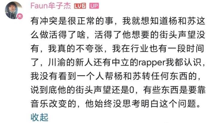 “川渝的新人和中立Rapper,我没看到一个人帮杨和苏转任何东西的。说到底他的街头声望还是0,有些东西是要靠音乐改变的,他始终没思考明白这个问题”