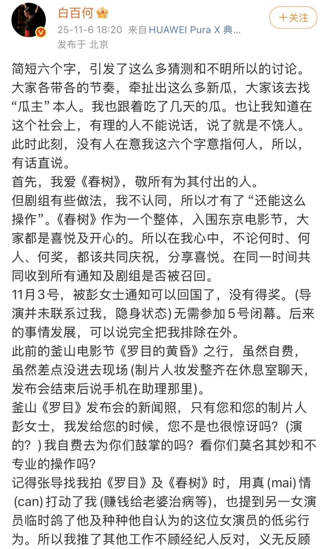 11月6日,白百何回应此前发文“还能这么操作”引发的争议,表示自己对剧组的有些做法不认同。11月3日她被通知可以回国没有得奖,“后来的事情发展,可以说完全把我排除在外”,还谈到釜山电影节自费参加和张律导演“卖惨”找她拍戏,“回头看,有些事有些人,确实不值得被选择,有些做法反而是聪明的决定。”
