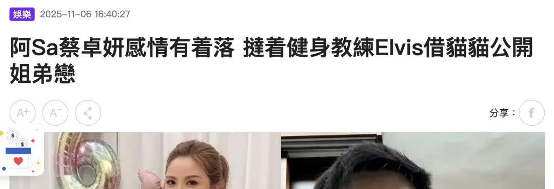 6日,港媒曝阿Sa蔡卓妍新恋情,称其与健身教练Elvis林俊贤交往中,说两人数月来发展稳定,阿Sa也已向好友认定了Elvis的男友身份。据悉,两人曾在今年七夕被拍一起看林家谦演唱。昨日,阿Sa受访被问是否有新发展、何时会公开?她回答:“随缘吧,找日啦!”