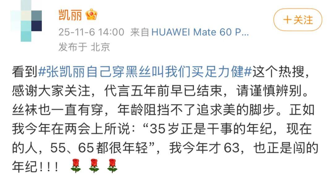 2025年11月初,63岁演员张凯丽因在公开活动中穿黑色丝袜搭配高跟鞋亮相,引发网络热议,部分网友调侃这与她曾代言的足力健老人鞋形成反差。事件迅速登上热搜话题。11月6日,张凯丽亲自发文回应,强调代言早已结束,并自信表达“年龄阻挡不了追求美的脚步”。