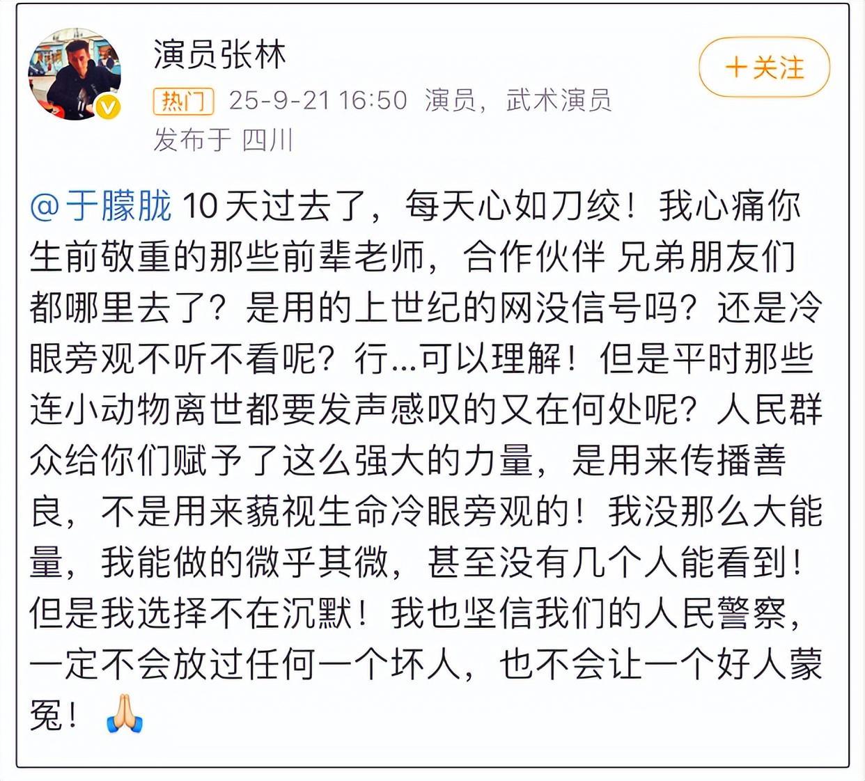 即便到了9月12日,仍有圈内人在为其发声。演员张林是一名无数演员,称于朦胧去世后自己每天心如刀绞。他心痛于朦胧生前敬重的那些前辈、合作伙伴、兄弟朋友们,为什么冷眼旁观不听不看。