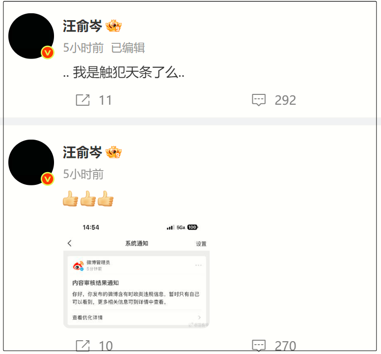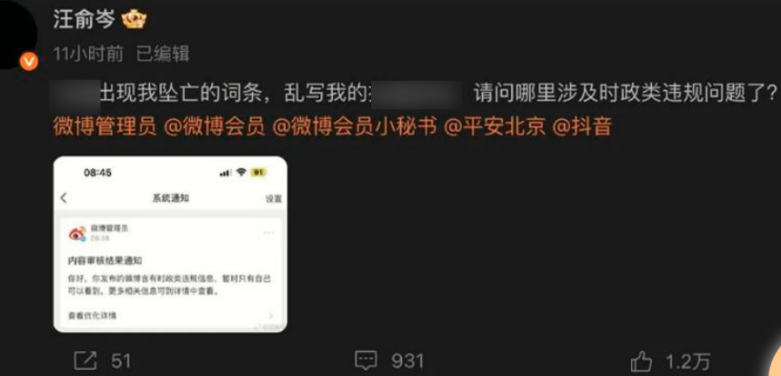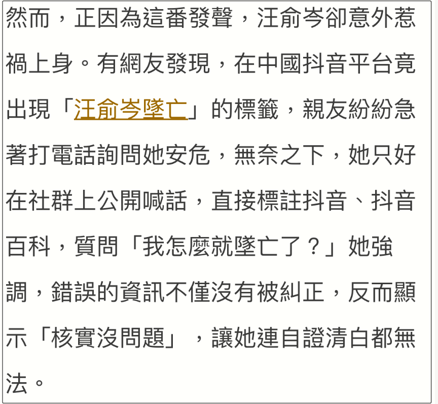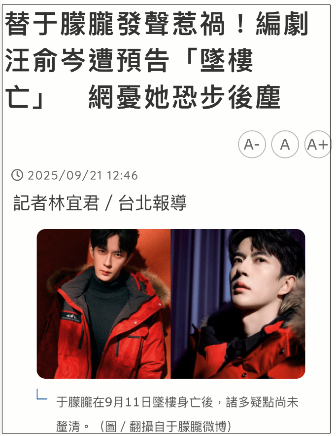编剧汪俞岑在于朦胧去世第一时间发声,感谢他曾救下试图轻生的自己,至今IP仍是黑色,没想到却被造谣自己也坠楼身亡了,他发声质问却被删除,反倒是台媒报道了此事。