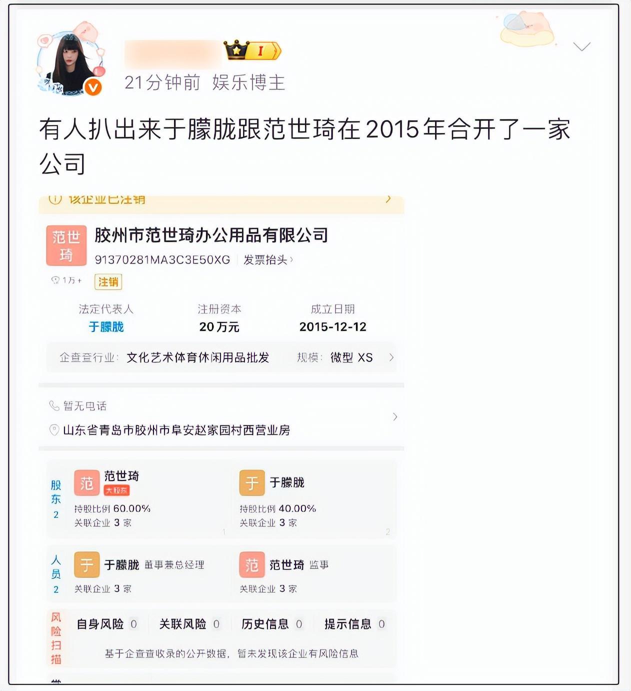 与此同时,又有网友扒出范世琦和于朦胧在2015年合开了一家公司,范世琦占股60%,于朦胧占股40%。网友认为两人有合作开公司,说不定有利益的牵扯。