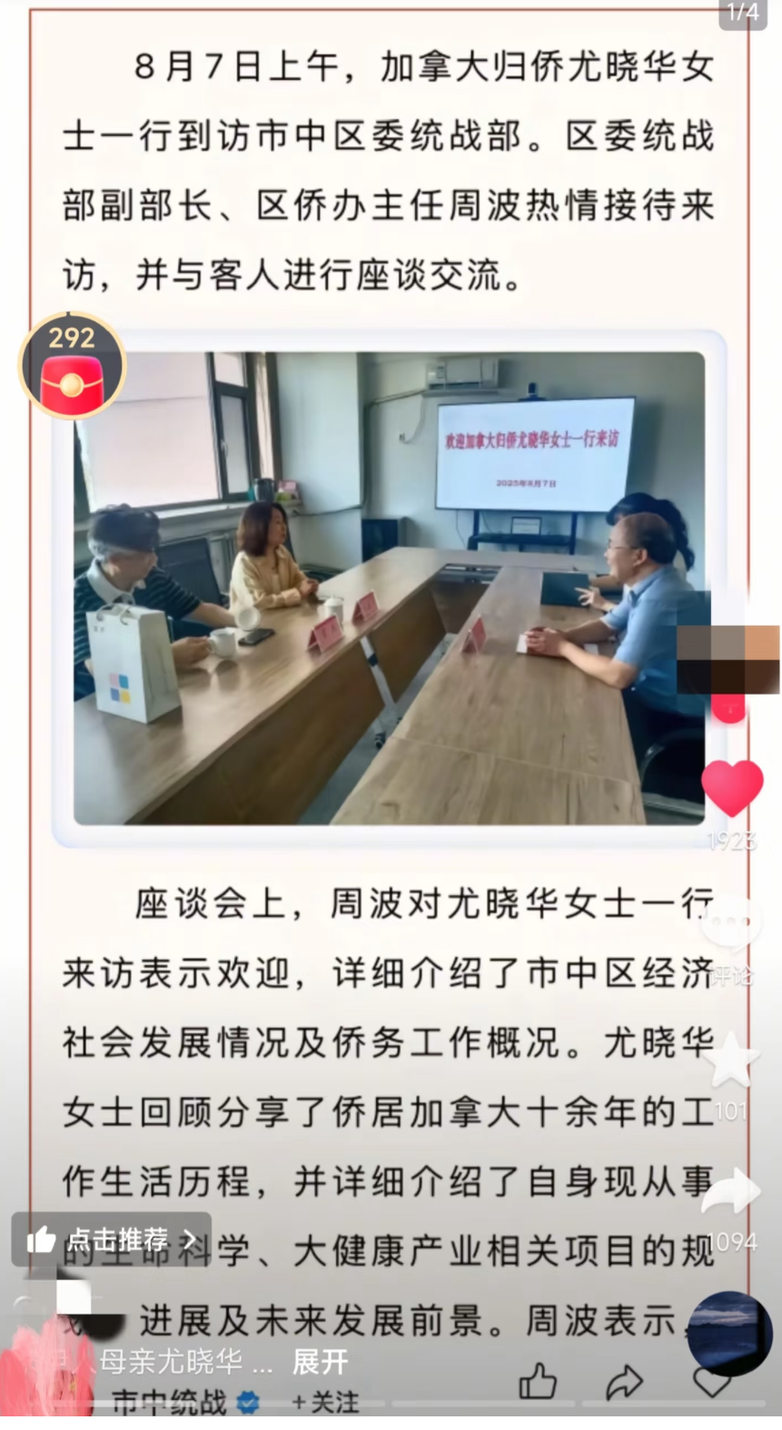 此外,尤晓华还曾作为加拿大归侨被当地热情接待,她谈到了自己从事的生命科学、大健康产业相关项目的规划......