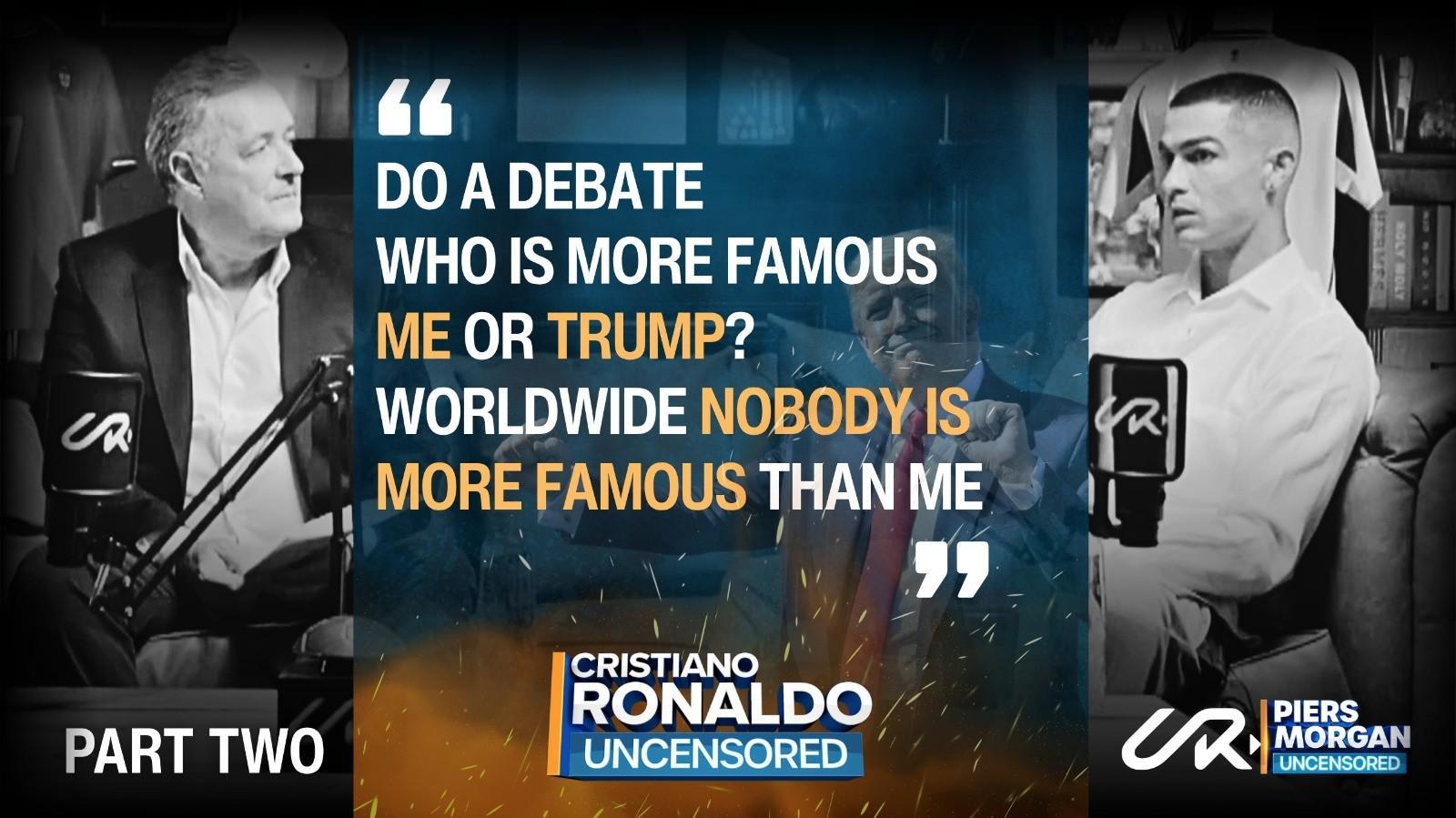 北京时间11月6日,英国知名主持人皮尔斯·摩根在社交平台发布了C罗专访第二部分的预告片段,其中一段关于知名度的对话引发全球热议。预告中,C罗直言不讳地表示自己比特朗普更出名,甚至放言“全世界没人比我更出名”。