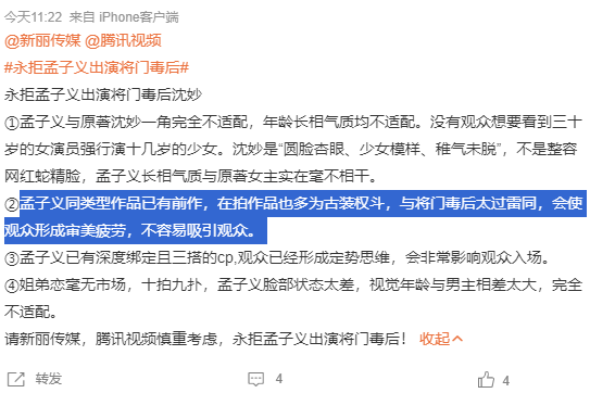 又说孟子义这类题材的剧拍的太多了同质化太严重,对制作方来说恐怕会造成cp分流,导致剧播后效果不佳。