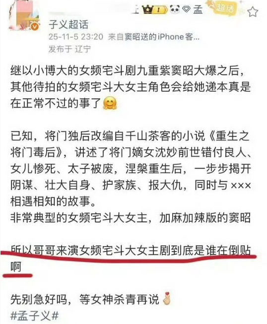 孟子义粉丝发言了:你一男演员到女频宅斗剧里演男主,到底是谁在倒贴啊。