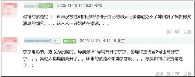 难怪网友质疑白百何在找补,认为本质是她没得奖,所以在发泄不满。实际上,导演在内的所有人都不知道会不会得奖,很多人提前都离开了,只有白百何还在东京等消息。等到3日晚上才出通知,有些临时赶回来,有些取消航班。白百何等了几天没得奖,反而是挂件男主王传君得奖了,她可能受到冲击,于是用“过河拆桥 ”表达不满。
