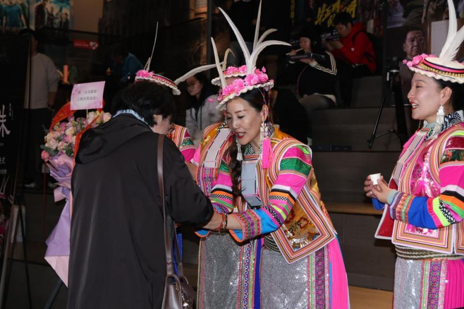 11月4日晚,到场观众行走于电影片段的屏幕背景下,穿上白马坎肩、戴上翎毛帽子、接过蜂蜜酒,在四姐妹高亢悠扬的敬酒歌声中移步至影厅,仿佛置身于白马的古老村寨之中,感受白马的文化盛宴。