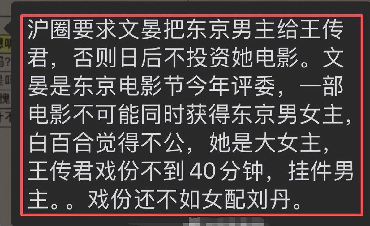 前面我们也说了,有小道消息称,“沪圈要求文晏将奖颁给王传君,否则不给她的电影投资”。
