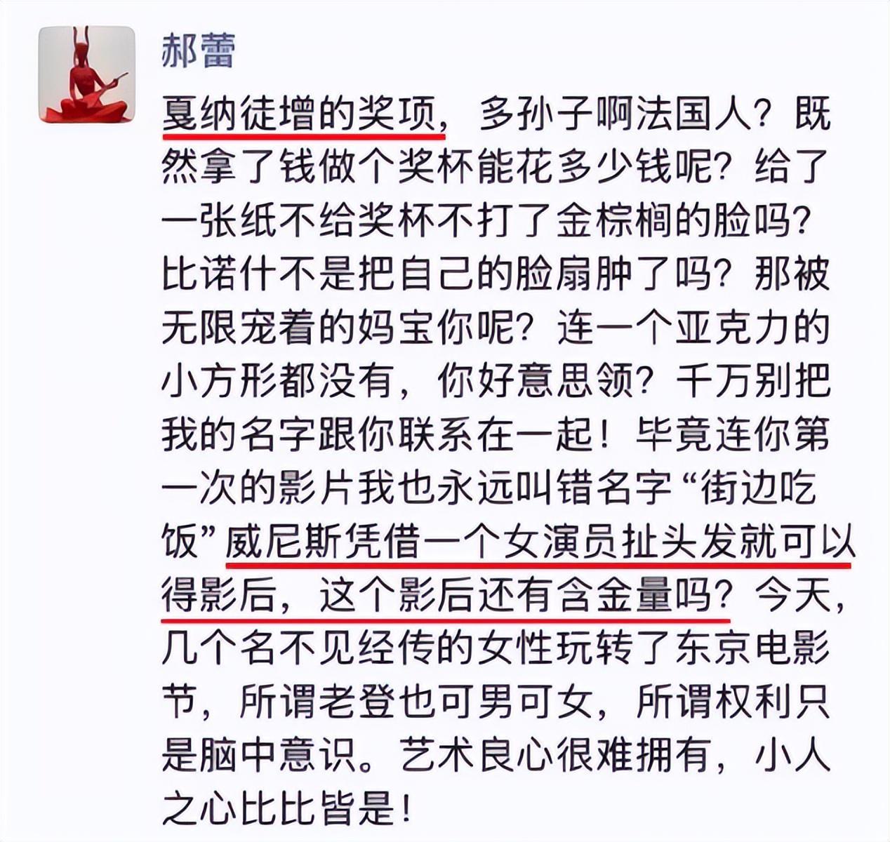 不仅“爆粗口”吐槽了戛纳,还扯出了辛芷蕾在威尼斯电影节获奖的事,直言对方的影后没什么含金量。