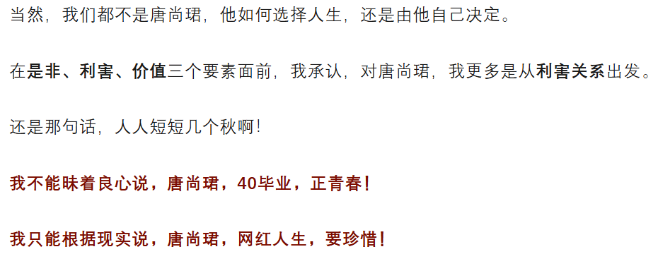 我完全是从一个互联网研究者的角度,从个体人生价值利益最大化角度,劝慰唐尚珺放下包袱,轻装上阵,安心做网红。