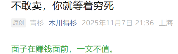 恰好,今天中午,我看到一篇文章,标题叫《不敢卖,你就等着穷死》,也算是个爆款。