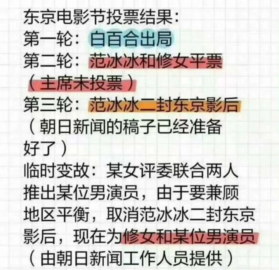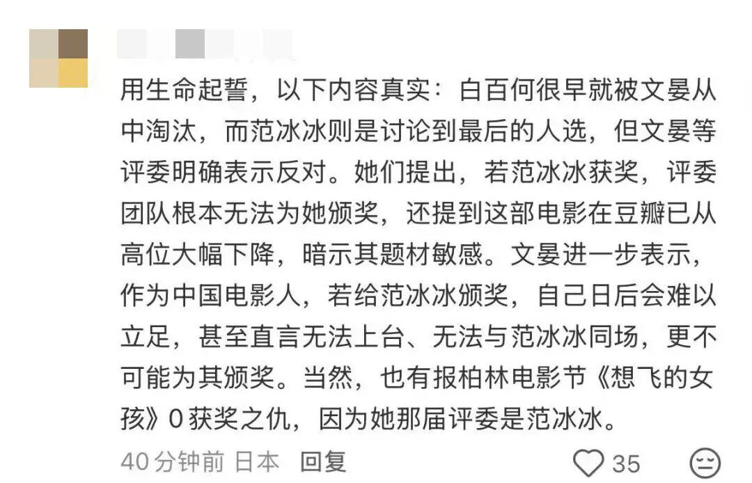 更多的细节则是,白百何在第一轮比拼中就被淘汰,最终的人选本来是范冰冰(主演电影《地母》),但文宴以“无法上台为她颁奖”为由亲手否了。
